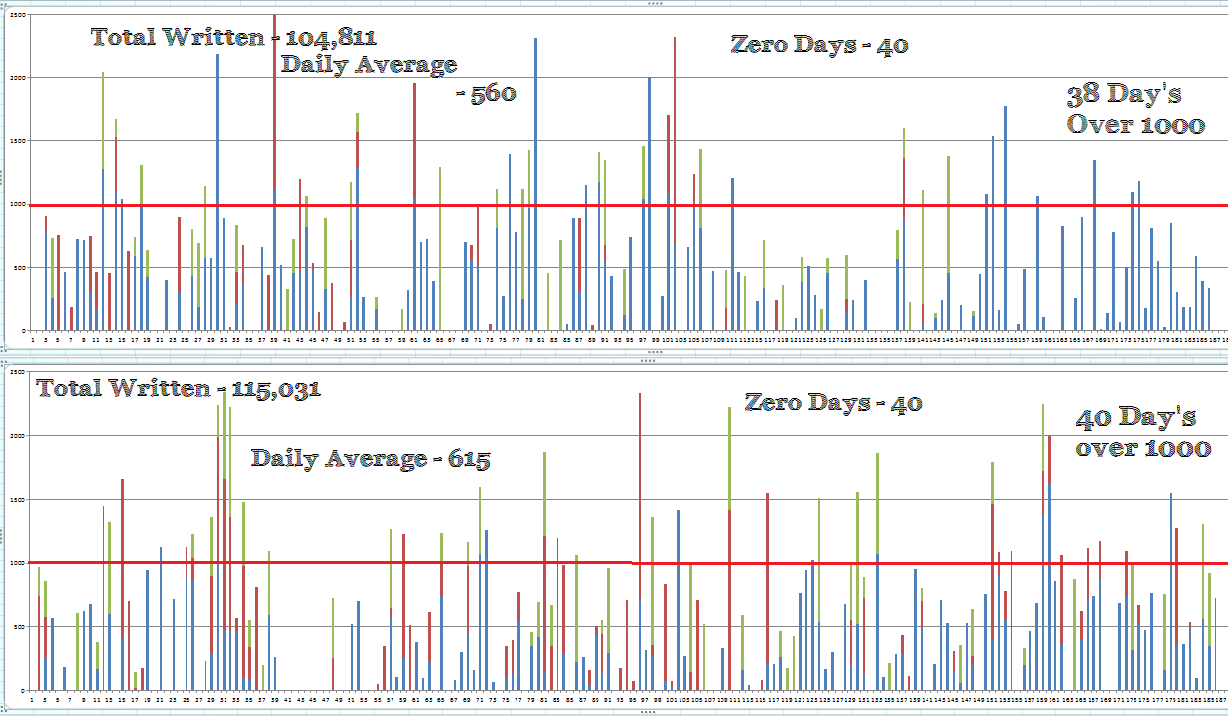 Before this month my average for writing was 3-500 words. That’s it. Some days less, some days more, but never enough to make me feel like writing could be a full time career. A writer needs to do one thing above all others: write. If you aren’t writing then how can you make a living writing? Does a swimmer swim? Does a musician play an instrument? If they aren’t doing that thing then how do they make the money?